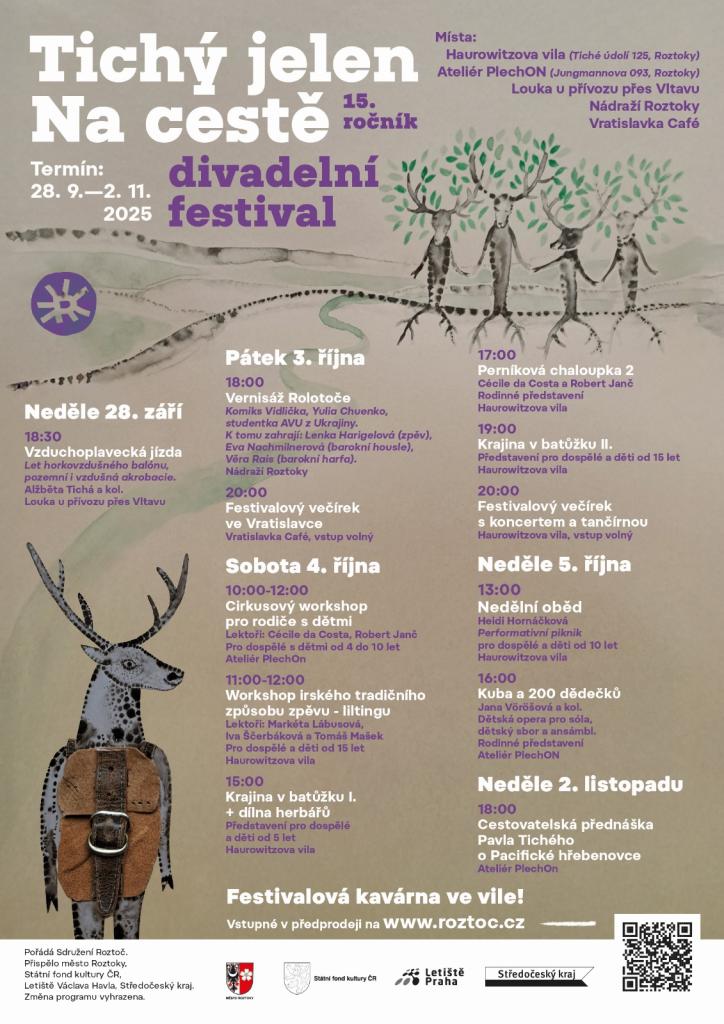 • Festival s podtitulem Na cestě se rozprostře na čtyřech scénách. Program můžete navštívit v Haurowitzově vile (neboli ve Vile 125), v Ateliéru PlechOn (Jungmannova 093, Roztoky), na louce u přívozu a na nádraží Roztoky.